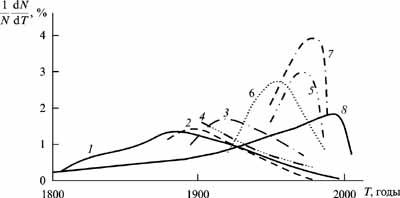 Однако принятие квадратичного закона, приводящего к гиперболической кривой роста, обращающейся в бесконечность за конечное время, смущало многих исследователей. Из формулы (3.1) следует, что критическое время расходимости очень близко, и если тенденция роста, имевшая место до 1965 г., сохранится, такое время наступит в T1=2025 г. Это обстоятельство привело к тому, что некоторые (одни -- с юмором, а другие -- с ужасом!) увидели в описании демографического взрыва предвестника конца света [52].