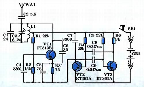 На транзисторе VT1 собран генератор радиоколебаний, работающий на частоте около 27 мГц. Этот сигнал модулируется низкой частотой порядка 1 кГц. Посылка сигнала происходит, когда нажата кнопка SB1, и узел получает питание от батареи GB1. Модулятор построен на транзисторах VT2, VT3 по схеме симметрического мультивибратора. В моменты, когда транзистор VT2 открыт, происходит соединение плюсовой цепи генератора с одноименной цепью источника и последний вырабатывает управляющий сигнал. VT2 запирается, и генерация высокой частоты на время прекращается.