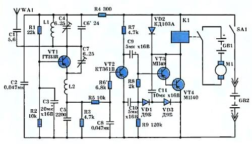Последнее при этом замыкает свой контакт, подавая на электродвигатель M1 привода питание от «силовой» батареи GB1. Разделение цепей питания приемника (от батареи GB2) и привода защищает приемник от коммутационных помех на коллекторе и щетках двигателя и, что существенно, позволяет наилучшим образом подобрать питание к тому типу движка, каким располагает конструктор устройства.
