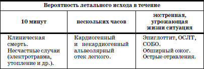 Угрожающее неотложное состояние у детей – это состояние, при котором происходит декомпенсация жизненно важных функций организма ребенка (дыхания, кровообращения, нервной системы) или имеется непосредственная опасность ее возникновения. В зависимости от времени возникновения летального исхода Э.К. Цибулькин выделяет следующие группы угрожающих состояний: