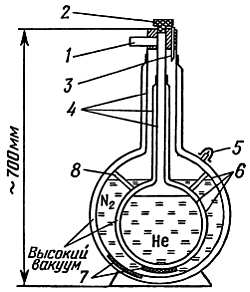 1 — трубка для выхода испаряющегося гелия; 2 — отверстие для переливания жидкого гелия, закрытое пробкой; 3 — трубка для заливки жидкого азота; 4 — тонкостенные трубки из нержавеющей стали; 5 — штуцер вакуумной откачки; 6 — медные полированные сферы, каждая из которых спаяна из двух полусфер; 7 — адсорбент; 8 — трубки, соединяющие между собой вакуумные полости и одновременно служащие распорками