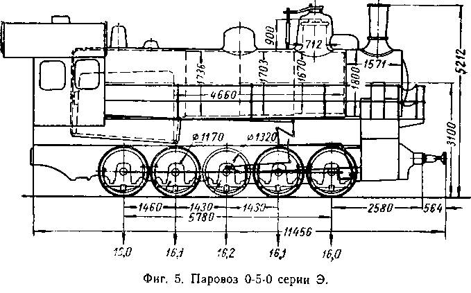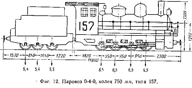 На фиг. 12 изображен паровоз 0-4-0 колеи 750 мм типа 157 с нагрузкой на ось 6,5 г и трехосным тендером, являющийся в настоящее время одним из лучших паровозов этой колеи. Эти паро