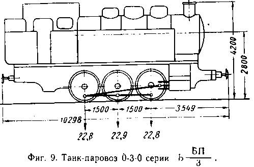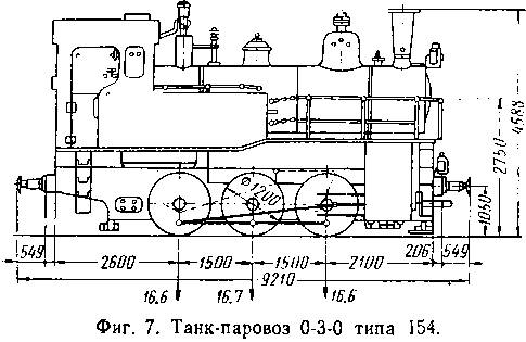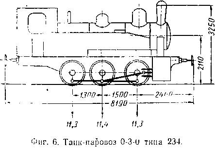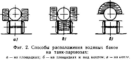 Самый распространенный тип танк-паровоза имеет две или три сцепные оси, причем давление на ось у некоторых паровозов доходит до 25 т. Баки для воды располагаются на площадках по бокам котла (фиг. 2, а), по бокам и между листами рамы паровоза