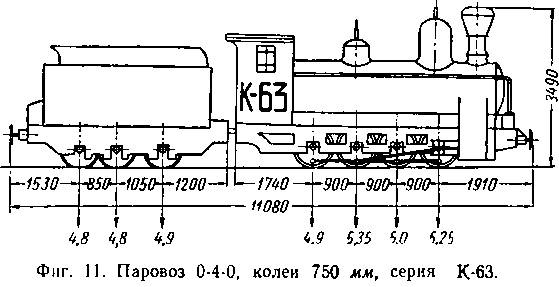 Паровозы узкой колеи 750 мм. Паровозы серии К-63 (фиг. И), построенные на Коломенском заводе в 1897—1902 гг., являются вторым вариантом ранее выпускавшихся паровозов серии К-60. В отличие от первого выпуска, у паровозов второго выпуска Диаметр цилиндров увеличен с 330 до 355 мм, диаметр ведущих колес — с 650 до 750 мм.