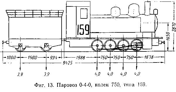 Паровоз 0-4-0, типа 159 (фиг. 13) с давлением на ось 4 г, колеи 750 мм, строился для промышленного транспорта на нескольких заводах.
