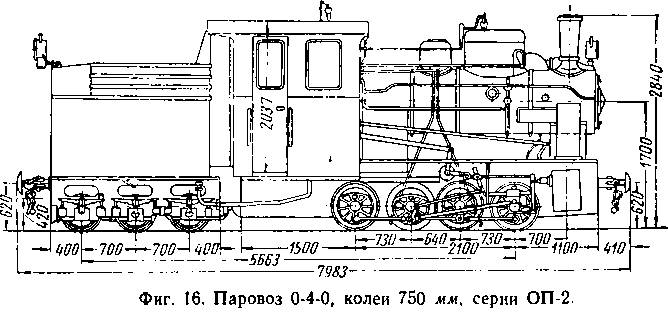 Для работы на ветках узкоколейных железных дорог с облегченным верхним строением пути используются паровозы типа 0-4-0 серии ОП-2 с нагрузкой на ось 2,3 т (фиг. 16).