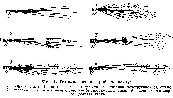 о сорте стали: мягкие стали, с малым содержанием углерода, дают пучок соломенно-желтых искр; чем больше в стали углерода, тем пучок искр ярче (фиг. 1).