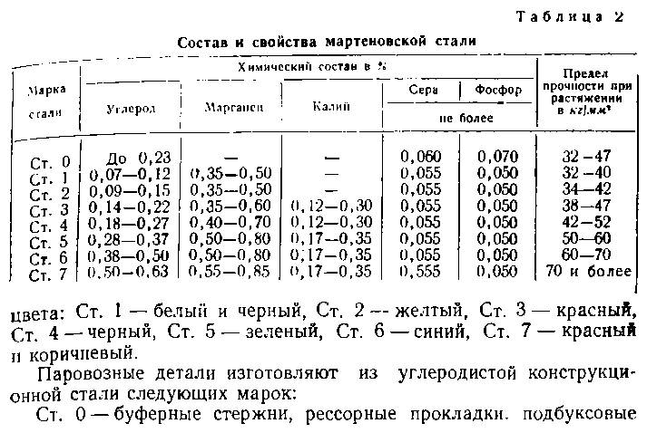 Углеродистая горячекатанная сталь обыкновенного качества изготовляется на металлургических заводах по ГОСТ 380-50. В зависимости от механических свойств и химического состава сталь делится на марки: Ст. 0, Ст. 1, Ст. 2 и т. д. до Ст. 7 (табл. 2).
