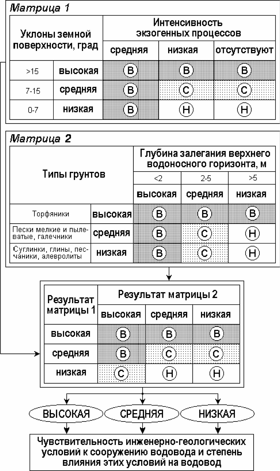 Сначала составлялись две парные матрицы. Первая – для уклонов и экзогенных процессов, вторая – для типов грунтов и глубины залегания подземных вод. К низкой чувствительности в первой матрице относились территории с небольшими уклонами и низкой интенсивностью экзогенных процессов либо их отсутствием. К средней чувствительности относились территории с уклонами <15°, при условии, что экзогенные процессы выражены здесь слабо либо отсутствуют. Для всех иных сочетаний интенсивности экзогенных процессов и уклонов принималась высокая чувствительность.