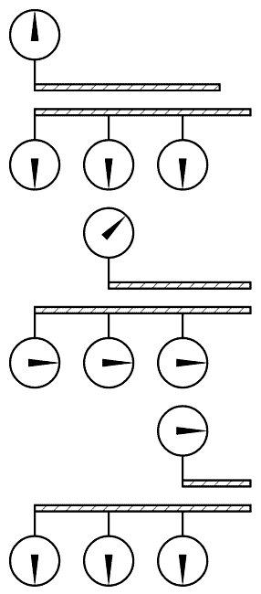 На первом рисунке положения стрелок верхних и нижних часов ради удобства взяты одинаковыми; так мы их поставили сами. Все часы показывают одинаковое время. На втором рисунке мы видим относительные положения обеих систем спустя некоторое время. Все часы в нижней системе показывают одинаковое время, но часы в верхней системе вышли из общего ритма. Их ритм изменился, и время отличается вследствие того, что часы движутся относительно нижней системы. На третьем рисунке мы видим, что различие в положении стрелок со временем увеличилось. Наблюдатель, покоящийся в нижней системе координат, нашел бы, что движущиеся часы изменили свой ритм. Конечно, тот же результат получился бы, если бы часы двигались по отношению к наблюдателю, покоящемуся в верхней системе координат; в этом случае в верхней системе должно было бы быть много часов, а в нижней только одни. Закон природы должен быть одинаков в обеих системах, движущихся друг относительно друга.