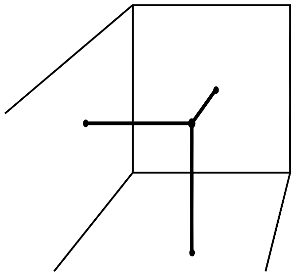 Еще один пример. Представим себе, что вы хотите в качестве системы координат рассматривать свою комнату. Это означает, что вы хотите любое положение тела определить относительно стен комнаты. Положение кончика лампы, если она в покое, может быть описано тремя числами: два из них определяют расстояние от двух перпендикулярных стен, а третье — расстояние от пола или потолка. Каждой точке пространства соответствуют три определенных числа; каждым трем числам соответствует определенная точка в пространстве (рис. 60).