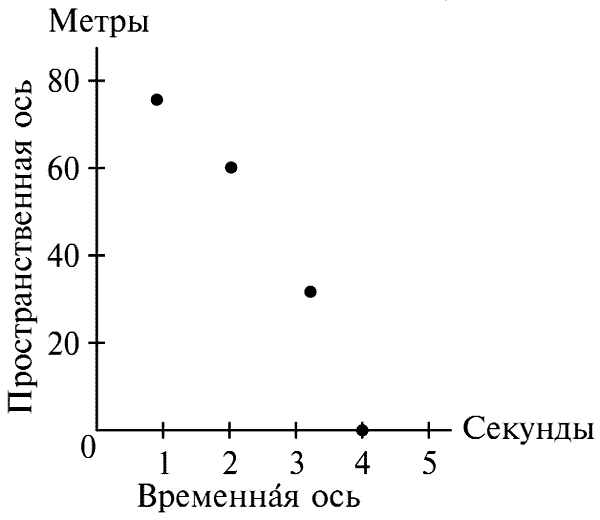 В нашей «временн?й таблице» зарегистрированы пять событий, каждое из которых представлено двумя числами — временем и пространственной координатой каждого события. Первое событие есть начало движения камня с высоты 80 метров от земли в момент, равный нулю. Второе событие есть совпадение камня с нашим твердым стержнем (башней) на высоте 75 метров от земли. Это имеет место по истечении одной секунды. Последнее событие есть удар камня о землю.