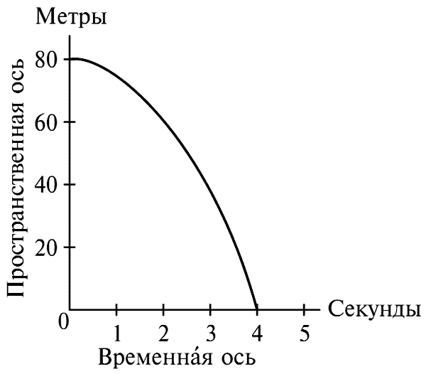 Вернемся к частице, падающей с 80-метровой башни. Наша графическая картина движения есть полезное соглашение, так как она позволяет нам характеризовать положение частицы в любой произвольный момент времени. Зная, как движется частица, мы хотели бы изобразить ее движение еще раз. Сделать это можно двумя путями.