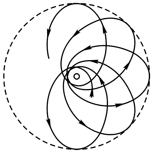 Если старые законы вытекают из новых, когда силы тяготения слабы, то отклонения от ньютонова закона тяготения можно ожидать только для сравнительно больших сил тяготения. Возьмем нашу солнечную систему. Планеты, и среди них наша Земля, движутся по эллиптическим орбитам вокруг Солнца. Меркурий — планета, наиболее близкая к Солнцу. Притяжение между Солнцем и Меркурием сильнее, чем между Солнцем и любой другой планетой, так как расстояние его от Солнца меньше. Если имеется какая-либо надежда найти отклонение от закона Ньютона, то наибольший шанс — движение Меркурия. Из классической теории следует, что путь, описываемый Меркурием, того же вида, как и путь любой другой планеты, и отличается лишь тем, что он ближе к Солнцу. Согласно общей теории относительности движение должно немного отличаться. Не только Меркурий должен вращаться вокруг солнца, но и эллипс, который он описывает, должен очень медленно вращаться относительно системы координат, связанной с Солнцем (рис. 69).