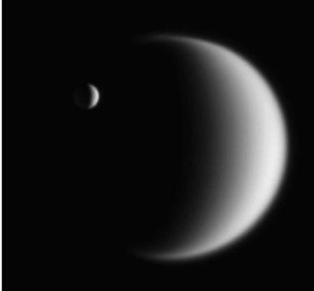 Рис. 8.16. Титан (справа) и Энцелад из системы Сатурна. Этот снимок довольно точно передает соотношение их размеров (10:1). Фото получено аппаратом «Кассини» 5 февраля 2006 г., когда расстояние от него до Энцелада составляло 4,1 млн км, а до Титана – 5,3 млн км.