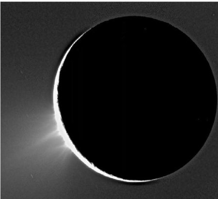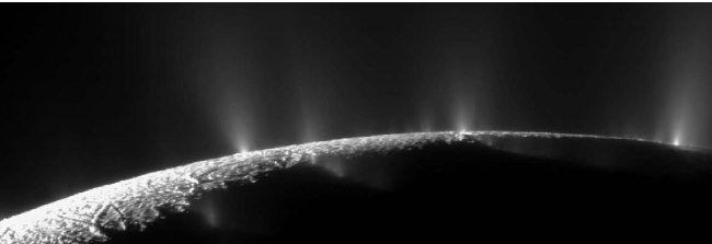 Рис. 8.18. Ледяные гейзеры в южной полярной области Энцелада. Некоторые из выбросов видны даже на ночной стороне. Фото: «Кассини».