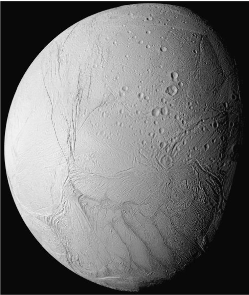Невысокая средняя плотность Энцелада (1,6 г/см3) говорит о преимущественно водном составе его недр. На это же указывает идеально сферическая форма этого весьма небольшого тела. Действительно, вся его поверхность покрыта льдом, причем очень чистым, прекрасно отражающим солнечный свет, не хуже, чем свежевыпавший снег. Кстати, по этой причине там очень холодно, почти -200 °C на поверхности. Поразительной особенностью Энцелада является неоднородное распределение метеоритных кратеров по его поверхности: северное полушарие покрыто ими довольно густо, а южное почти лишено кратеров. Учитывая, что метеориты не падают прицельно, остается заключить, что ледяная поверхность южного полушария в геологическом смысле более молодая, т. е. существуют процессы, «стирающие» там кратеры.