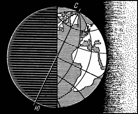 Оказывается, что лучи Солнца только два раза в году — 21 марта и 23 сентября — падают на Землю под прямым углом к оси её вращения. Это значит, что только два раза в году — весной и осенью — бывает так, что день и ночь длятся по 12 часов, всю же остальную часть года либо ночь бывает длиннее дня, либо день длиннее ночи.