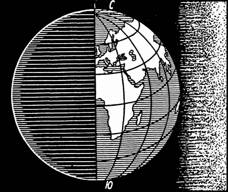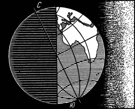 Посмотрите теперь на рис. 9. На нём тоже изображена Земля, освещённая справа солнечными лучами. Однако ось вращения Земли на этот раз наклонена в противоположном направлении: северный её конец от Солнца, а южный — к Солнцу. Северный полюс с окружающей его частью земной поверхности погружён в темноту. На нём и около него круглые сутки длится ночь. Несколько дальше от него смена дня и ночи происходит, но всюду день короче ночи. В северном полушарии Земли будет зима. В южном полушарии Земли в это время, очевидно, лето. Там день либо длиннее ночи, либо (на южном полюсе и поблизости от него) длится круглые сутки.