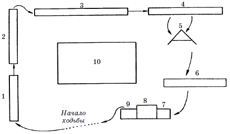 Рис. 20. Дорожки здоровья для детей второго и третьего года жизни: 1 – стесанное бревно; 2 – гимнастическая скамья; 3 – ребристая доска; 4 – скамья для подлезания; 5 – лесенка-стремянка; 6 – бревно для перешагивания; 7, 8, 9 – кубы разной величины; 10 – ковер для выполнения общеразвивающих упражнений