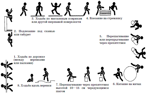 Целесообразно, чтобы дети занимались босиком, так как трение между босой ногой и пособием увеличивается и ребенку легче выполнять упражнения. Кроме того, занятия босиком способствуют профилактике плоскостопия. Чтобы воспитанники привыкали к этому постепенно, сначала занятия можно проводить на ковре, а затем на полу (степень закаленности определяется врачом).