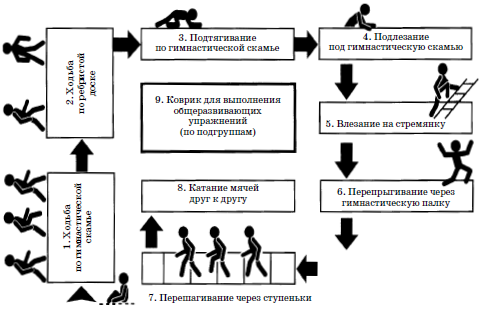 Возможно и другое комплектование. Оно определяется количеством взрослых, участвующих в занятии (при большем количестве детей должно быть двое взрослых), наличием пособий, размером помещения (при маленькой подгруппе занятия можно провести на любом условно огороженном пространстве; большие подгруппы требуют зала). Занятие можно провести по типу «Дорожки здоровья» (рис. 20).