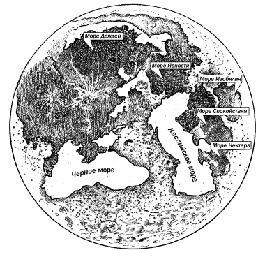 Чтобы сделать наглядными размеры лунных «морей» по сравнению с земными, на рис. 40 на карту Луны наложены в том же масштабе контуры Черного и Каспийского морей. Сразу видно, что лунные «моря» не особенно велики, хотя и занимают заметную часть диска. Море Ясности, например (170 000 км2), приблизительно в 2? раза меньше Каспийского.