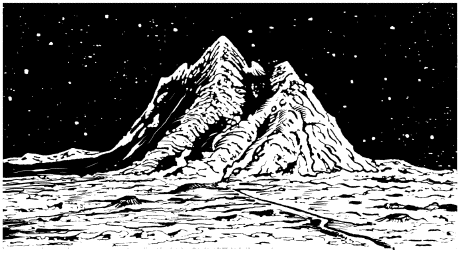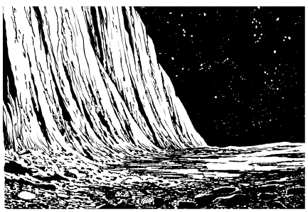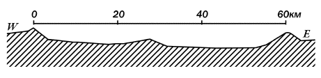 Но ни фотографии, ни наблюдения в телескоп не дают представления о том, какой казалась бы лунная поверхность наблюдателю на самой Луне. Стоя непосредственно возле лунных гор, наблюдатель видел бы их в иной перспективе, чем в телескоп. Одно дело рассматривать предмет с большой высоты и совсем иное – сбоку вблизи. Покажем на нескольких примерах, в чем проявляется это различие. Гора Эратосфен представляется с Земли в виде кольцевого вала с пиком внутри. В телескоп она вырисовывается рельефно и резко благодаря четким, неразмытым теням. Взгляните, однако, на ее профиль (рис. 42): вы видите, что по сравнению с огромным поперечником кратера – 60 км – высота вала и внутреннего конуса очень мала; отлогость склонов еще более скрадывает их высоту.