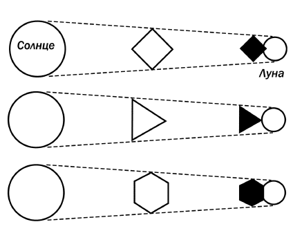 Картина в самом деле загадочная: хотя, вопреки убеждению чеховской девицы, нельзя сквозь закопченное стекло «увидеть линию, соединяющую центр Солнца и Луны», но мысленно провести ее мимо Земли при таком расположении вполне возможно. Может ли наступить затмение, если Земля не заслоняет Луны от Солнца? Можно ли верить такому свидетельству очевидца?