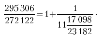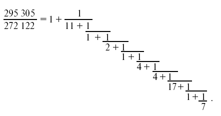 Получается огромный, в десятки тысячелетий, период времени, практически бесполезный. Древние астрономы довольствовались решением приближенным. Наиболее удобное средство для отыскания приближений в подобных случаях дают непрерывные дроби. Развернем дробь