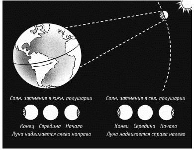 Рис. 59. Почему для наблюдателя в северном полушарии Земли диск Луны во время затмения надвигается на Солнце справа, а для наблюдателя в южном полушарии – слева?