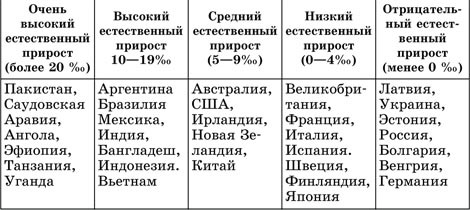 Численность населения Земли увеличилась почти с 2,5 млрд человек в 1950 г. до 6,7 млрд в 2008 г. В 60—80-е годы ХХ в. темпы прироста населения резко возросли и составили примерно 2% в год. Это явление получило название «демографического взрыва» однако сейчас пик его уже пройден и, несмотря на высокие (в конце ХХ, начале ХХI вв. она ежегодно возрастала на 75—80 млн человек) абсолютные значения, прирост населения снизился до 1,2%. Воспроизводство населения (естественный прирост) – это совокупность процессов рождаемости и смертности. Рождаемость и смертность – это число родившихся или умерших в расчете на тысячу жителей. Естественный прирост – это их разность, он может быть как положительным, так и отрицательным (таблица 3). Для мира в целом в настоящее естественный прирост определялся формулой 21 – 9 = 12 чел. на 1000, однако в разных регионах мира его значения сильно различаются: в Зарубежной Европе он в среднем равен 0, в Северной Америке – 6, в Латинской Америке и Зарубежной Азии – 15, а в Африке – 24.