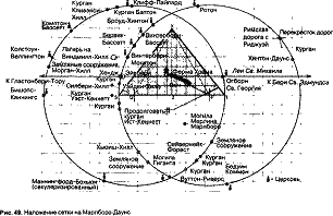 Как я и предполагал, леи Святого Михаила проходит в двух квадратах севернее основания сетки. Тем не менее, если не считать церковь в Винтерборн-Монктон, перекресток дорог на Риджуэн и Могилу Гиганта, ни один другой объект восточного круга не попадает точно на сетку (рис. 49).