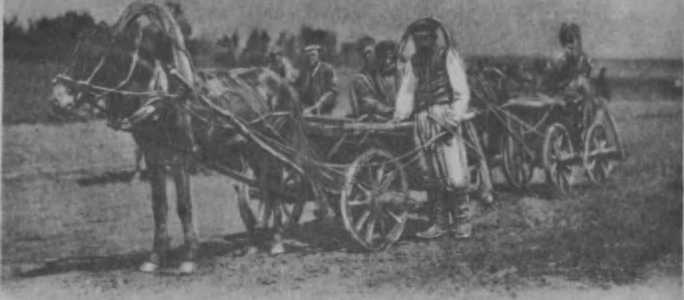 Щодо упряжі, то, крім тої технічної ріжниці. яка залежить від ріжниці самих возів - кінського та волового, існує ще й етнографічна ріжниця. На Лівобережжю та на невеличкому просторі прибережної смуги Київщини всі кінські вози мають оглоблі та дугу, а дишель - тільки ватові; a щодо Право бережжя та цілої західньої України, то тут усі вози, як кінські, так і волові, мають дишлі, пе мають ніколи дуги, а за місць східнього хомута вживається тут шлея. Треба, правда, зазначити, що оглоблі існують і в західній Україні, але головним чином в одноконних санях та особливо при ралі та при бовкуні, цебто коли запряжено одного тільки вола чи одну корову. Щодо дуги, то її фінське походження, здається, з достатньою очевидністю довів небіжчик В. В Стасов, і на Україні дуга, безперечно, є запозиченням, що перейшло до нас або через Білорусь, або безпосередньо від великоросів. Щодо цього останнього шляху, то його робить трохи сумнівним як форма української дуги, звичайно дуже легкої та не дуже плоскої, так і порівнюючи вбога її орнаментація, що обмежується тільки скромним різьбленим візерунком з повішю відсутністю розмальовання чи позолоти. Такою самою скупістю оздоб одзначаеться й український упряж; на ньому зовсім немає жадних кутасів, мідних оздоб, дзвіночків тощо, які мали у фіинів значіння охоронних амулетів та перетворились у великоросів у звичайні оздоби, що дуже вперто іаховукггь свою первісну форму. Запрягу тройкою, власне кажучи, на Україні також немає, з винятком дрібних поміщиків та нижчих урядовців, що вважають за особливий шик їздити тройкою з фурманом, одягненим по-великоруському. Нема чого й казати про те, що своїм упряжем та иншими зазначеними тут рисами українці, за вказаними винятками, наближаються до південних та західніх слав’ян.