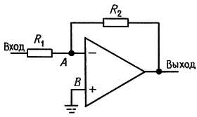 3. Воспользовавшись теперь правилом II, получим Uвых/R2 = — Uвх/R1 или коэффициент усиления по напряжению = Uвых/Uвх = — R2/R1. Позже вы узнаете, что чаще всего точку В лучше заземлять не непосредственно, а через резистор. Однако сейчас это не имеет для вас значения.