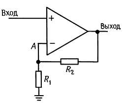 Как определить входной импеданс рассматриваемой схемы? Оказывается, просто. Потенциал точки А всегда равен 0 В (так называемое мнимое заземление, или квазинуль сигнала). Следовательно, Zвх = R1. Пока вы еще не знаете, как подсчитать выходной импеданс; для этой схемы он равен нескольким долям ома.