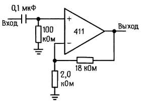 Обратите внимание, что конденсатор должен быть большим. Если для построения усилителя переменного тока использовать неинвертирующий усилитель с большим усилением, то конденсатор может оказаться чрезмерно большим. В этом случае лучше обойтись без конденсатора и настроить напряжение сдвига так, чтобы оно было равно нулю (этот вопрос мы рассмотрим позже в разд. 4.12). Можно воспользоваться другим методом — увеличить сопротивления резисторов R1 и R2 и использовать Т-образную схему делителя (разд. 4.18).