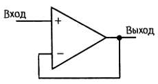 Усилитель с единичным коэффициентом усиления называют иногда буфером, так как он обладает изолирующими свойствами (большим входным импедансом и малым выходным).