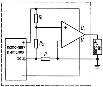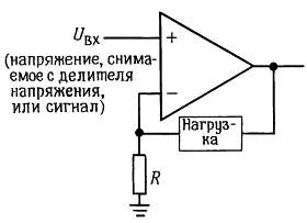 Резисторы R1 и R2 образуют делитель напряжения для установки тока. Чтобы вид этой схемы не смущал вас, напомним, что «земля» — это понятие относительное. Любую точку в схеме можно назвать «землей». Представленную схему используют для формирования токов, протекающих через заземленную нагрузку, но ее существенный недостаток в том, что управляющий вход является плавающим, это значит, что выходной ток нельзя задать (запрограммировать) с помощью входного напряжения, отсчитываемого от потенциала земли. Методы устранения этого недостатка изложены в той части гл. 6, где рассматриваются источники питания постоянного тока.