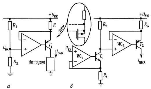 В первой схеме обратная связь создает на резисторе R падение напряжения, равное UKK — Uвх, которое в свою очередь порождает эмиттерный ток (а следовательно, и выходной ток), равный IЭ = (UKK — Uвх)/R. При работе с этой схемой не приходится беспокоиться о напряжении UБЭ и его изменениях, связанных с изменениями температуры, IК, UКЭ и т. п. Несовершенство этого источника тока (не будем принимать во внимание ошибки ОУ: Iсм, UСДВ) проявляется лишь в том, что небольшой базовый ток может немного изменяться в зависимости от напряжения UКЭ (предполагаем, что операционный усилитель не потребляет входной ток); этот недостаток — небольшая плата за возможность использования заземленной нагрузки; если в качестве транзистора T1 использовать составной транзистор Дарлингтона, то погрешность будет существенно уменьшена. Погрешность возникает в связи с тем, что операционный усилитель стабилизирует эмиттерный ток, а в нагрузку поступает коллекторный ток. Если в этой схеме вместо биполярного использовать полевой транзистор, то проблема будет полностью решена, так как затвор полевого транзистора тока не потребляет.