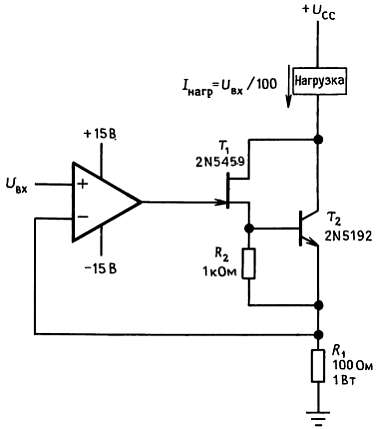 При минимальном значении IСИ для Т1, равном 4 мА, и подходящем значении β для Т2 величина тока, протекающего через нагрузку, может достигать 100 мА и более (для получения бóльших токов транзистор Т2 можно заменить транзистором Дарлингтона, при этом нужно соответственно уменьшить R1). В данной схеме были использованы полевые транзисторы с p-n-переходом, но еще лучше было бы использовать полевые МОП-транзисторы, так как для ОУ на полевых транзисторах с p-n-переходом требуется расщепленный источник питания, обеспечивающий диапазон напряжения на затворе, достаточный для перехода транзистора в режим отсечки. Ничего не стоит с помощью простого мощного полевого МОП-транзистора (МОП-структура с V-образной канавкой) получить ток побольше, однако мощным полевым транзисторам присущи большие межэлектродные емкости, а представленная здесь гибридная схема как раз и позволяет преодолеть связанные с этим проблемы.