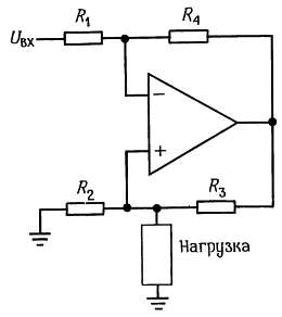 Источник тока Хауленда. На рис. 4.13 показан красивый учебный источник тока. Если резисторы подобраны таким образом, что выполняется соотношение R3/R2 = R4/R1, то можно показать, что справедливо равенство: Iн = — Uвх/R2.