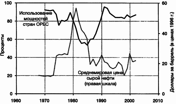 Рис. 6.7. Использование производственных мощностей стран-участниц OPEC и мировые цены на нефть