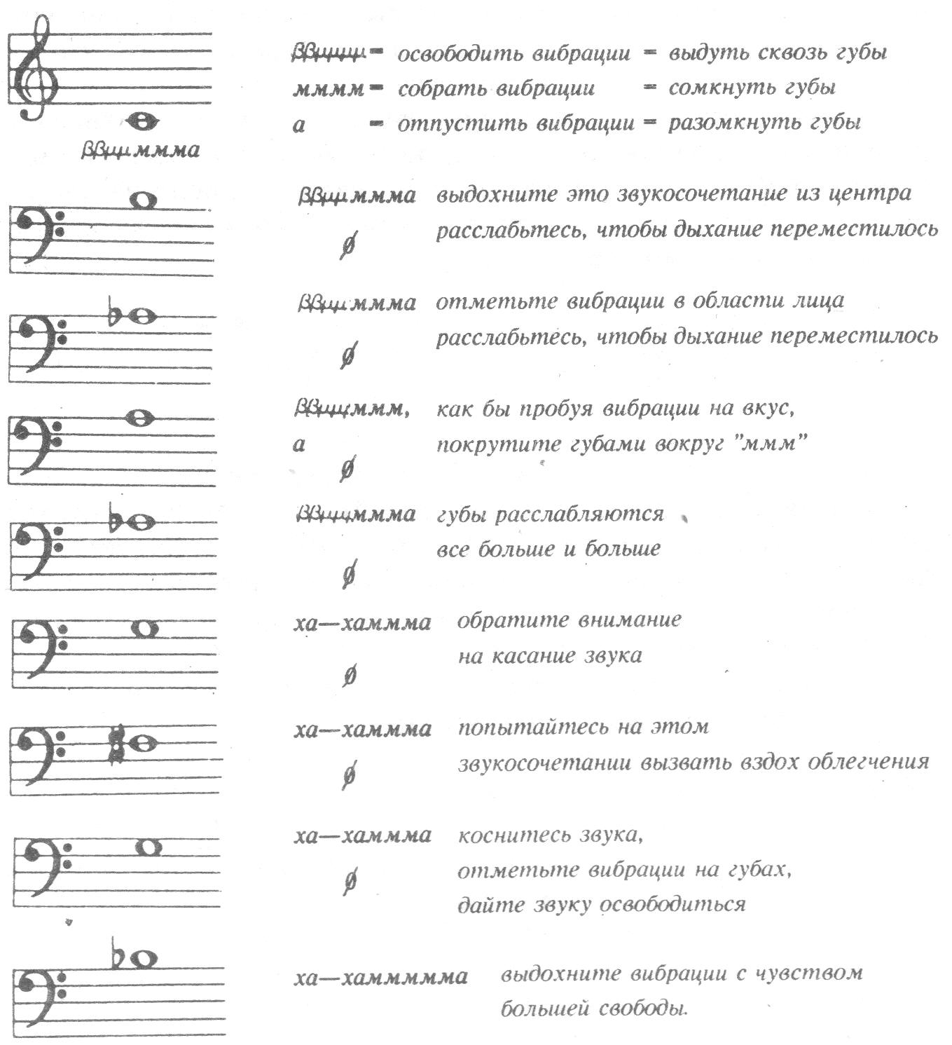 Только губы должны касаться друг друга, формируя "хамм". Язык не касается нёба — ни корнем, ни боковыми сторонами, ни серединой. Звук, сформированный в центре, не должен встретить на своем пути ни одной препятствующей ему поверхности до тех пор, пока он не достигнет губ. Иначе говоря, свободное пространство за губами должно вести прямо в дыхательный центр.