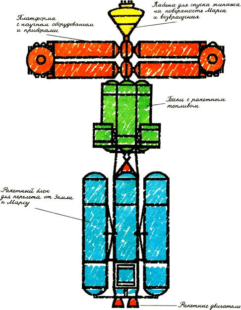 Как можно из отдельных частей собрать на орбите космический корабль, мы уже знаем. В Советском Союзе система автоматической сборки в космосе применяется более 20 лет. Ручная стыковка пилотируемых аппаратов не один раз использовалась и в советских и в американских полетах. Этот опыт вполне пригодится в марсианской экспедиции.