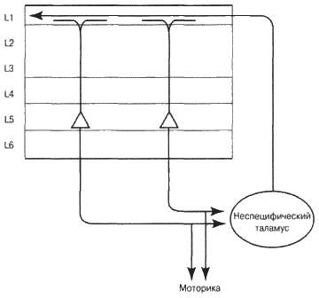 Существуют несколько путей от таламуса к коре головного мозга, но сейчас лишь один из них представляет для нас интерес. Он начинается с крупных нейронов слоя 5, проецирующихся на группу клеток таламуса, считающихся функционально неспецифическими. Аксоны этих неспецифических клеток идут назад, в слой 1 множества различных зон коры головного мозга. Например, нервные клетки слоя 5 зон V2 и V4 посылают аксоны к таламусу, а таламус, в свою очередь, отправляет информацию назад к слою 1 зон V2 и V4. Аналогичный процесс происходит и в других зонах коры головного мозга. Клетки слоя 5 множества корковых зон посылают сигналы в таламус, который, в свою очередь, отсылает назад информацию в слой 1 этих же самых и связанных с ними зон. Я считаю, что такой круговорот полностью дублирует обратную связь с задержкой, которая позволяет автоассоциативной памяти усваивать последовательности сигналов.