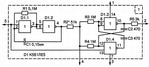 Задающий модуль сирены собран на элементах 2ИЛИ-НЕ микросхемы К561ЛЕ5. Элементы DD1.1 и DD1.2 образуют импульсный генератор, собранный по традиционной схеме с емкостной обратной связью через конденсатор С1. На элементах DD1.3 и DD1.4 собран симметричный триггер, обеспечивающий получение на выходе (вывод 2) прямоугольных колебаний типа «Меандр».