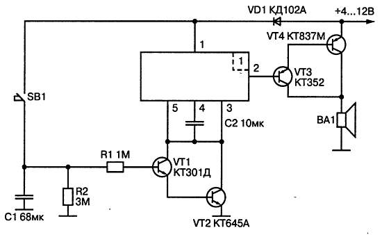 В исходном состоянии контакты тревоги SB1 разомкнуты, составной транзистор, образованный парой VT1, VT2, заперт, и генерация задающего модуля отсутствует. При замыкании контактов SB1 конденсатор С1 быстро заряжается от источника питания, и отпирается составной транзистор VT1/VT2. В результате выводы 3 и 5 задающего модуля заземляются и возникает генерация. Прямоугольные импульсы с выхода задающего модуля поступают на базу составного транзистора VT3/VT4, он отпирается каждым импульсом, и динамическая головка ВА1 воспроизводит звук, частота которого определяется задающим модулем. После размыкания контактов SB1 конденсатор С1 медленно разряжается, и через 2–3 минуты составной транзистор VT1/VT2 запирается, что приводит к прекращению генерации сигнала.