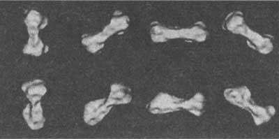 Например, покрытие звезды малой планетой Клеопатрой, наблюдавшееся в 1991 г. из разных мест Земли, позволило определить курьезный силуэт астероида По форме он напоминает гигантский огурец с выступом посередине (рис. 8). Длина тела казалась равной приблизительно 250 км, а ширина — в 4–5 раз меньше. Столь большая вытянутость малой планеты удивила специалистов, ведь многочисленные удары метеоритов постоянно дробят астероиды, скругляя их форму. Игра природы или… Интересно, что радиолокация и спектральный анализ показали — Клеопатра состоит из металла. 4 мая 2000 г. с помощью 305-метровой антенны в Обсерватории Аресибо (Пуэрто-Рико) был построен радарный портрет Клеопатры (рис. 9). С расстояния 171 млн км астероид похож на гигантскую кость размером 94 км на 217 км. Этот портрет заметно отличается от силуэта, определенного по покрытию звезды девятью годами ранее. Например, куда-то исчезла «гора» высотой 25 км. Изменяется ли Клеопатра на наших глазах — покажут будущие исследования.