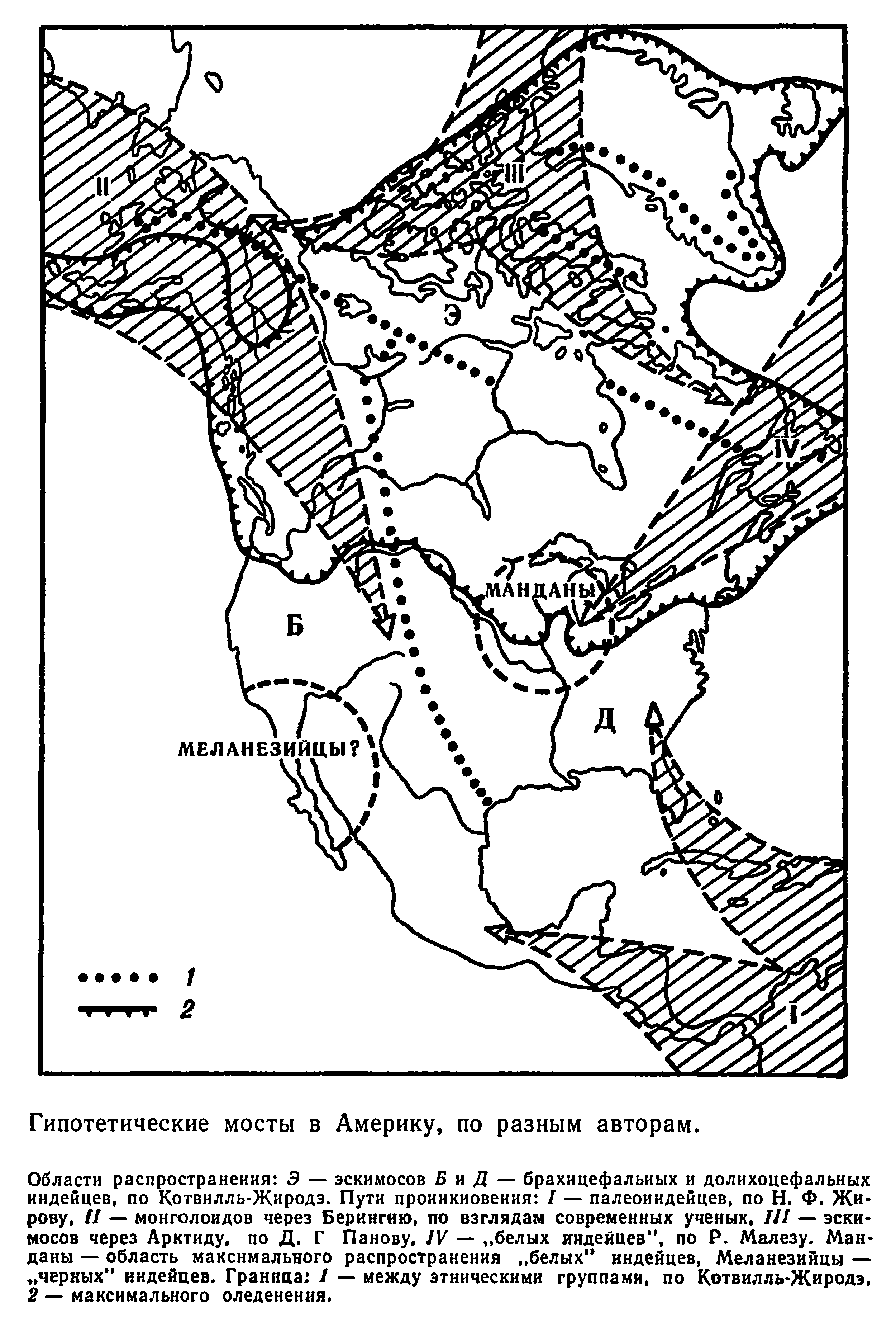 Области распространения: Э — эскимосов Б и Д — брахицефальных и долихоцефальных индейцев, по Котвилль-Жиродэ. Пути проникновения: I — палеоиндейцев, по Н. Ф. Жирову, II — монголоидов через Берингию, по взглядам современных ученых, III — эскимосов через Арктиду, по Д. Г Панову, IV — «белых индейцев» по Р. Малезу. Майданы — область максимального распространения «белых» индейцев, Меланезийцы — «черных» индейцев. Граница: 1 — между этническими группами, по Котвилль-Жиродэ, 2 — максимального оледенения.